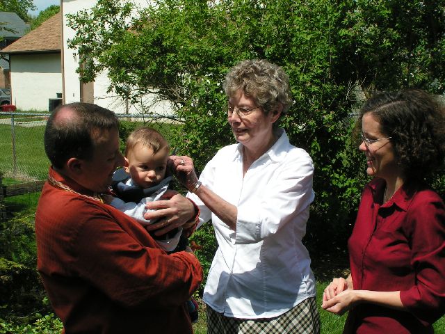 | Edwin Zola's very first haircut. Martin, Edwin, and Diane watch as Betty Wannemacher, Diane's great-aunt, gives Edwin that first cut. Diane remembers well Betty's late husband Romie giving Adam Budde Adam's first haircut (some sixteen years ago) and wanted to continue the family tradition. |